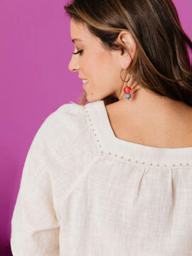 This boho flowy top is cut from pretty cotton slub fabric and features subtly flared sleeves and delicate hand embroidered details along the neckline. Swap out your plain white tee for this pretty top and elevate your style without sacrificing comfort.